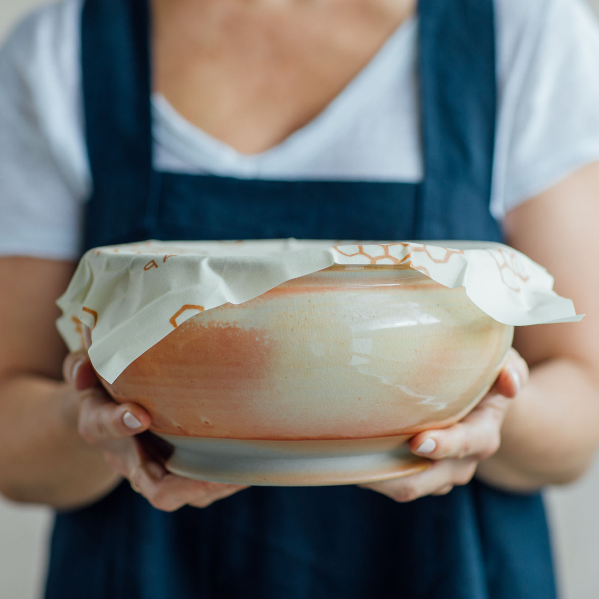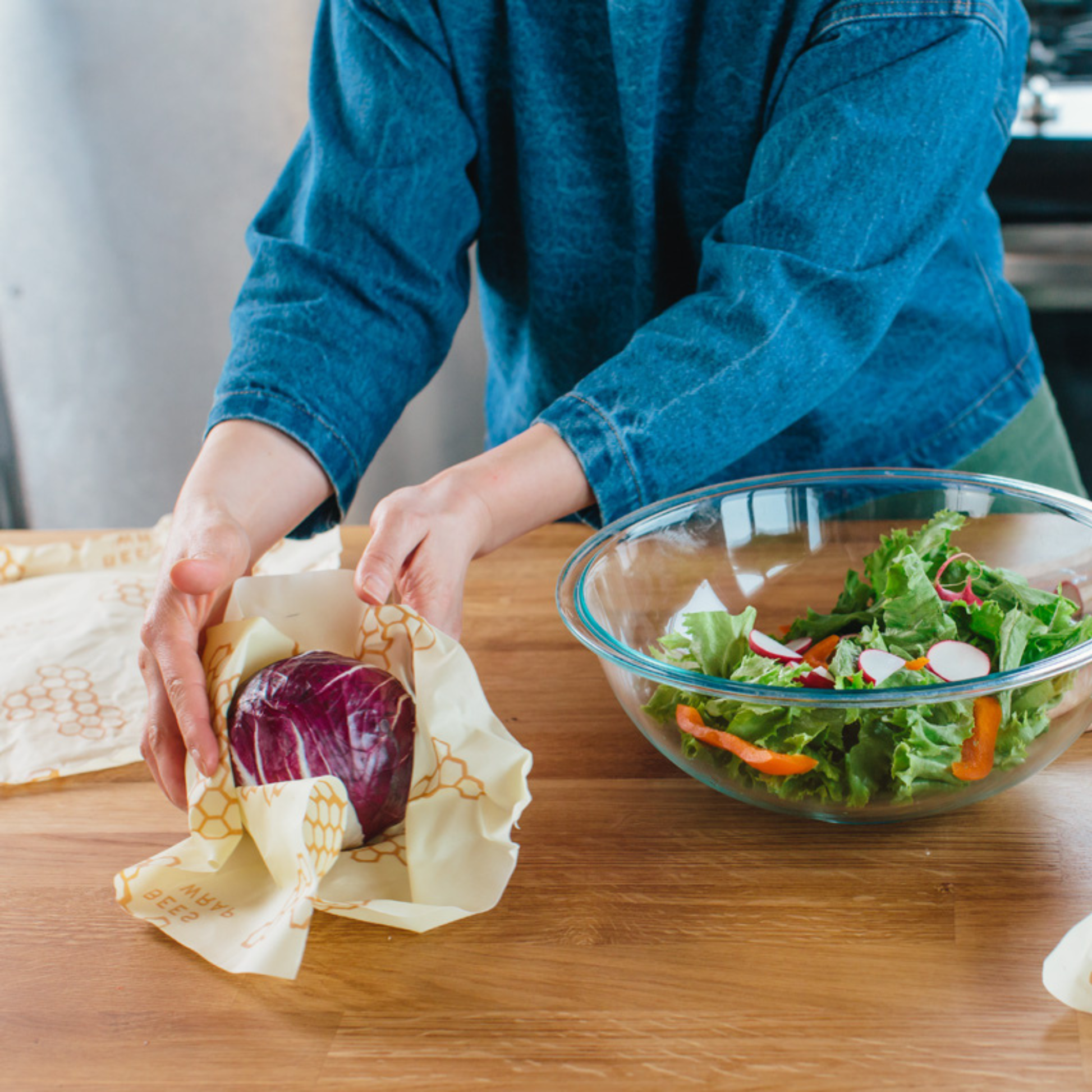 The hard working reusable beeswax food wrap can cover large bowls and containers, half a cabbage or cantaloupe, or wrap up a large wedge of parmesan cheese perfect to preserve left-overs, produce, cheeses, breads, and so much more!