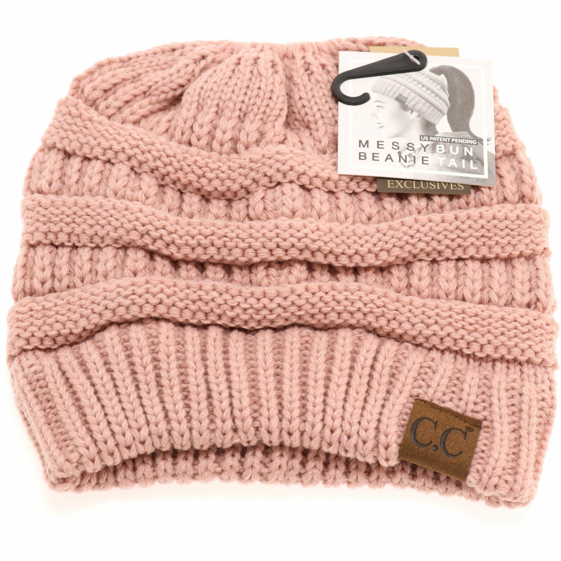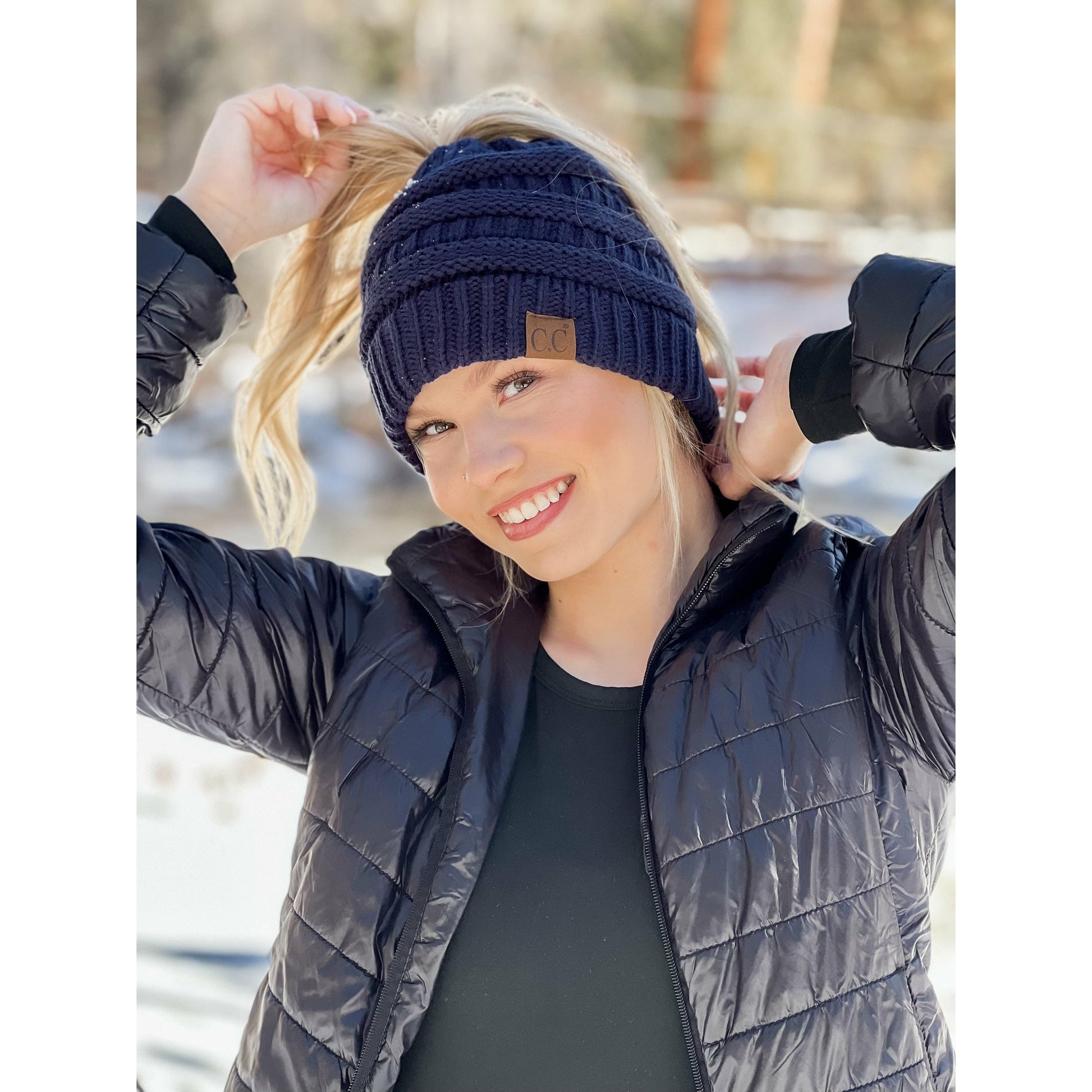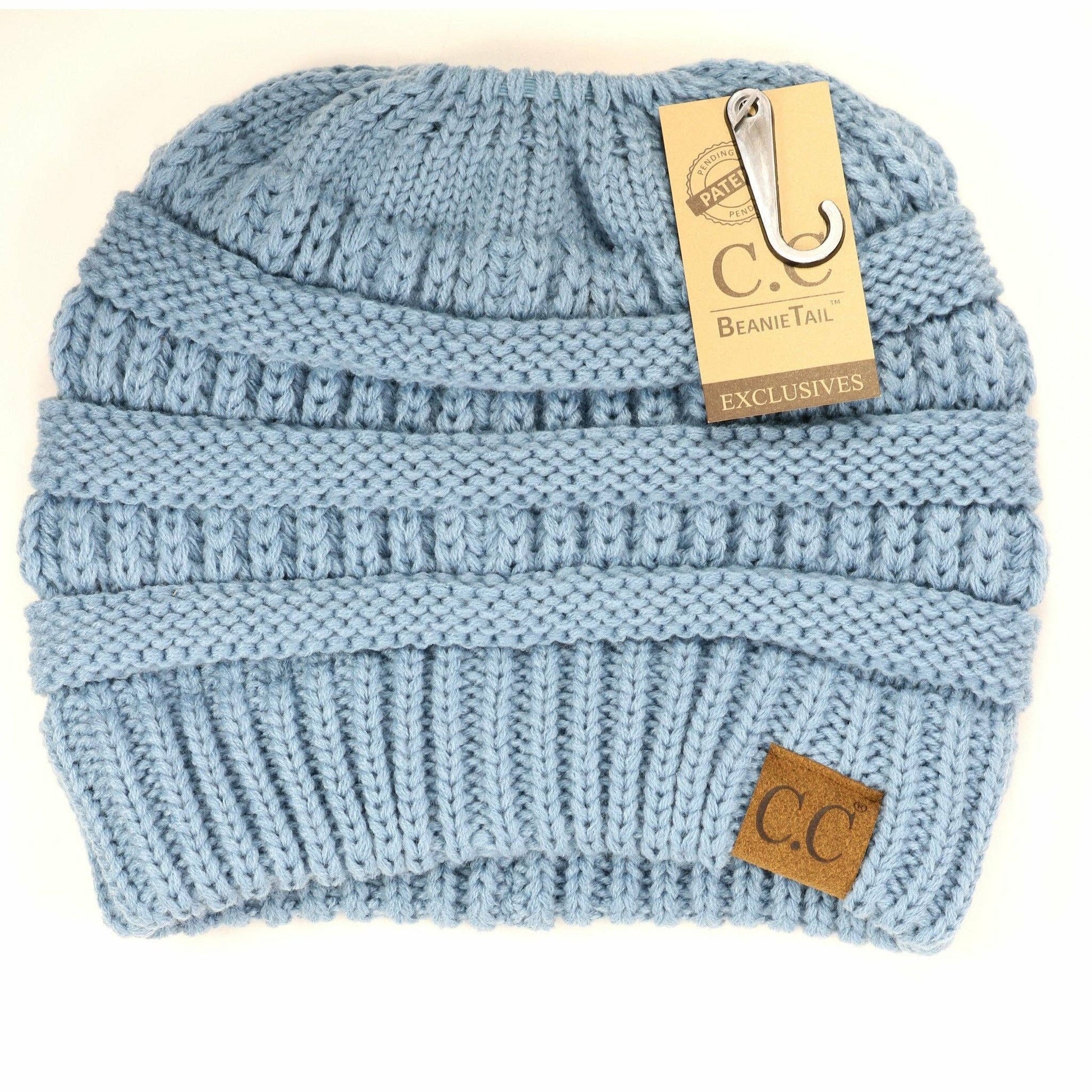 The original messy bun beanie! This CC beanie tail beanie allows you to wear your favorite head gear on a cold day, but pull your hair off your ears and neck! It features an elastic opening in the middle to keep the beanie in place without slipping!